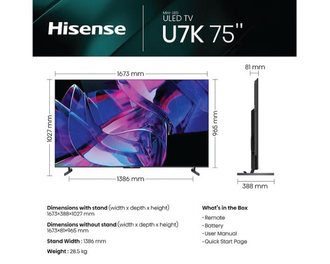 Hisense 75 Inch Smart 144Hz 4K Ultra HD HDR Mini-LED TV 75U7KQTUK