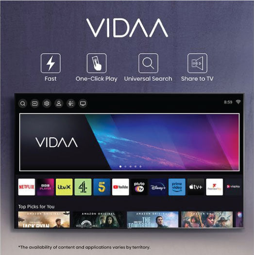 - Smart TV Services: Catch-up TV (BBC iPlayer, ITVX, My5, UKTV), Streaming (Amazon Prime Video, Apple TV, Disney+, Netflix, NOW TV, YouTube), Music (Deezer), App Store (VIDAA Store) Note: Some services only available in the UK